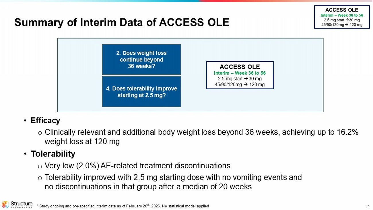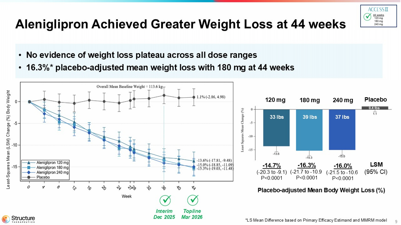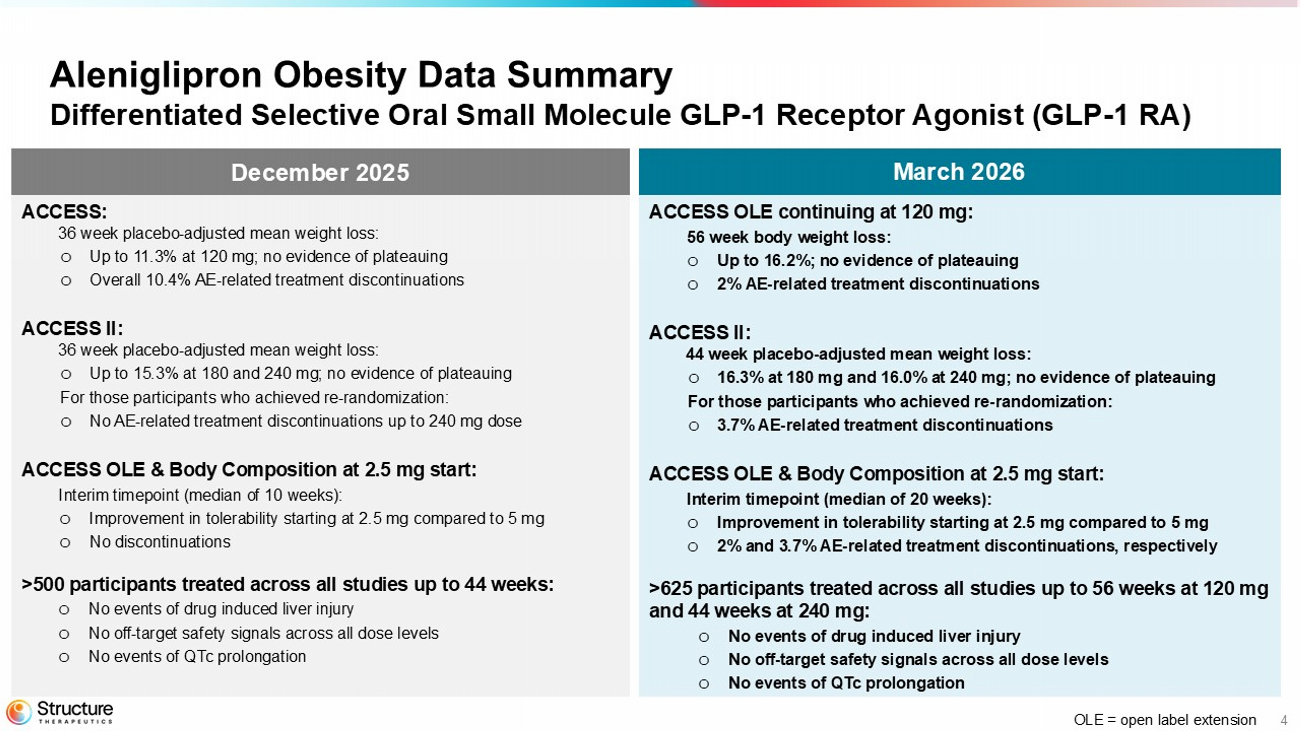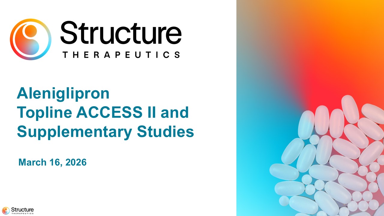 SAN FRANCISCO, March 16, 2026– Structure Therapeutics Inc. (NASDAQ: GPCR), a clinical-stage global biopharmaceutical company developing novel oral small molecule therapeutics for metabolic diseases, with a focus on obesity, today announced positive topline data from the ACCESS clinical program of aleniglipron for the treatment of people living with obesity and/or overweight with at least one weight related co-morbidity. This includes 44-week data from the Phase 2 ACCESS II study and interim data from the ongoing body composition study and the ACCESS open label extension (OLE) study. Aleniglipron is an investigational orally-available, once-daily, nonpeptide small molecule agonist of the glucagon-like-peptide-1 (GLP-1) receptor designed to address patient needs and accessibility.