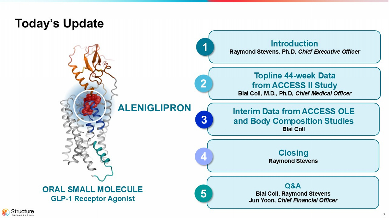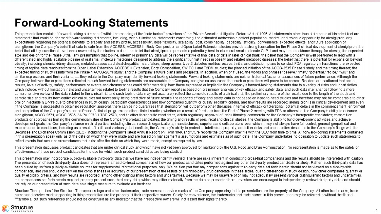 2 This presentation contains “forward - looking statements” within the meaning of the “safe harbor” provisions of the Private Securi ties Litigation Reform Act of 1995. All statements other than statements of historical fact are statements that could be deemed forward - looking statements, including, without limitation, statements concerning: the estimated addressable patient population, market, and revenue opportunity for aleniglipron; any expectations regarding the potential benefits, tolerability and safety profile, accessibility, dose flexibility, scalability, co st, combinability, capability, efficacy, convenience, expected effects, and future application of aleniglipron; the Company’s belief that data to date from the ACCESS, ACCESS II, Body Composition and Open Label Extension st udi es provide a strong foundation for the Phase 3 clinical development of aleniglipron; the belief that all key questions have been answered by the studies to date; the belief that aleniglipron represents a potentiall y b est - in - class oral small molecule GLP - 1 and may be a backbone therapy for obesity; the expected size and design for the Phase 3 trial; any presumption that topline, interim or preliminary data will be representative of fi nal data or data in later clinical trials; the belief that the Company is well positioned to lead with a differentiated and highly scalable pipeline of oral small molecule medicines designed to address the significant unmet needs in obesity and related metabolic diseases; the belief that there is potential for expansion beyond obesity, including chronic kidney disease, metabolic associated steatohepatitis, heart failure, sleep apnea, type 2 diabetes mel litus, osteoarthritis, and addiction; plans to conduct FDA regulatory interactions; the expected timing of topline data readouts from the Open Label Extension, ACCESS II Extension, Body Composition, SWITCH and T2DM studies ; t he planned initiation of the ACCG - 3535 Phase 1 study and the timing thereof; the expected timing of study results from the Phase 1 ACCG - 2671 study; and the Company’s future plans and prospects. In addition, wh en or if used, the words and phrases “believe,” “may,” “potential,” “to be,” “will,” and similar expressions and their variants, as they relate to the Company may identify forward - looking statements. Forward - looking s tatements are neither historical facts nor assurances of future performance. Although the Company believes the expectations reflected in such forward - looking statements are reasonable, the Company can give no assurance that such expectations will prove to be correct. Readers are cautioned that actual results, levels of activity, safety, performance or events and circumstances could differ materially from those expressed or imp lied in the Company’s forward - looking statements due to a variety of risks and uncertainties, which include, without limitation: risks and uncertainties related to topline results that the Company reports is based on pr eli minary analysis of key efficacy and safety data, and such data may change following a more comprehensive review of the data related to the clinical trial and such topline data may not accurately reflect the complete res ults of a clinical trial, the preliminary nature of the results due to the length of the study and sample size and results from earlier clinical studies not necessarily being predictive of future results; the reported effica cy and safety data is not based on head - to - head studies and therefore may not be comparable to other oral or injectable GLP - 1's due to differences in study design, participant characteristics and how companies quantify or qualify eligibility criteria, and how results are recorded; aleniglipron is in clinical development and even if the Company is successful in obtaining regulatory approval, there can be no guarantees that aleniglipron will outperform o the r therapies in terms of efficacy or tolerability; potential delays in the commencement, enrollment and completion of the Company’s planned Phase 3 clinical program and other clinical studies, whether as a result of feedback fro m the End - of - Phase 2 meeting with FDA or otherwise; the Company’s ability to advance aleniglipron, ACCG - 2671, ACCG - 3535, ANPA - 0073, LTSE - 2578, and its other therapeutic candidates, obtain regulatory approval of, a nd ultimately commercialize the Company’s therapeutic candidates; competitive products or approaches limiting the commercial value of the Company’s product candidates; the timing and results of preclinic al and clinical studies; the Company’s ability to fund development activities and achieve development goals; the Company's reliance on third parties, including clinical research organizations, manufacturers, supplie rs and collaborators, over which it may not always have full control; general geopolitical and macroeconomic conditions, including as a result of tariffs and various global conflicts; the Company’s ability to protect its in tellectual property; and other risks and uncertainties described in the Company’s filings with the Securities and Exchange Commission (SEC), including the Company’s latest Annual Report on Form 10 - K and future reports the Compa ny may file with the SEC from time to time. All forward - looking statements contained in this presentation speak only as of the date on which they were made and are based on management’s assumptions and estimate s a s of such date. The Company undertakes no obligation to update such statements to reflect events that occur or circumstances that exist after the date on which they were made, except as required by law. This presentation discusses product candidates that are under clinical study and which have not yet been approved for marketi ng by the U.S. Food and Drug Administration. No representation is made as to the safety or effectiveness of these product candidates f
