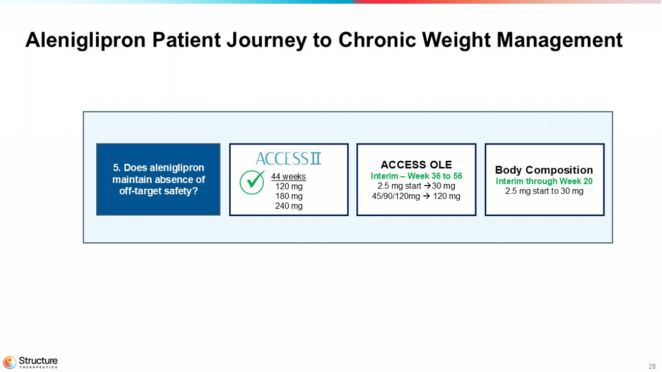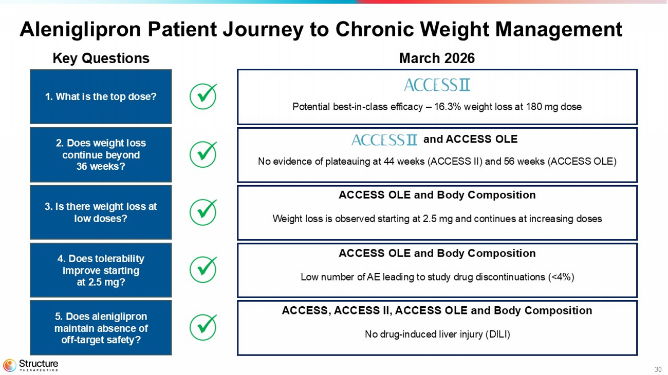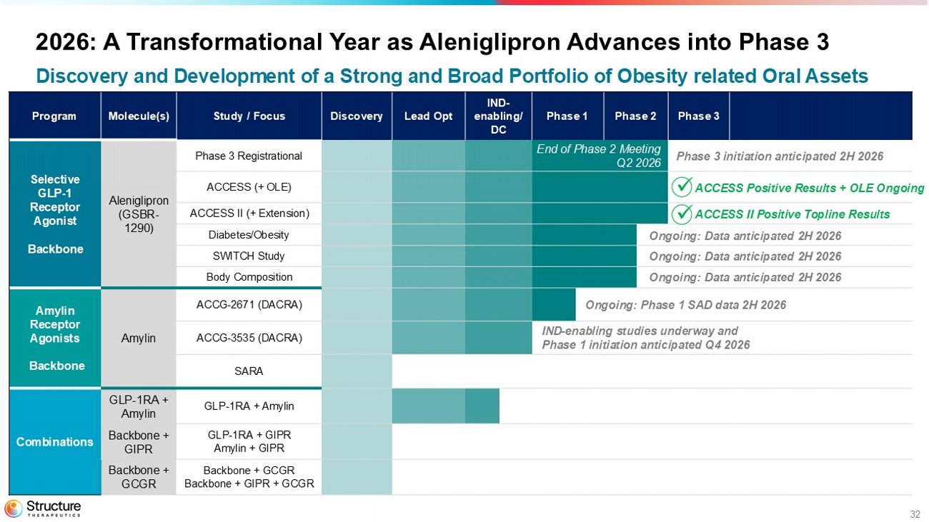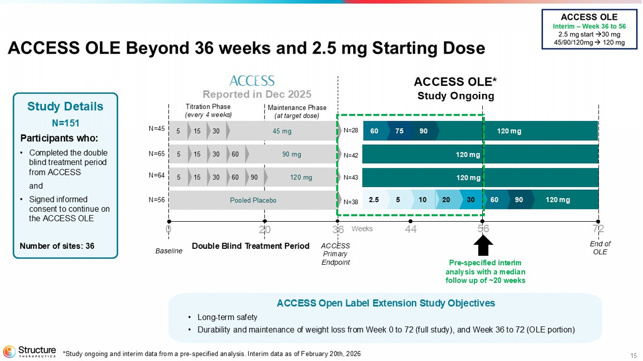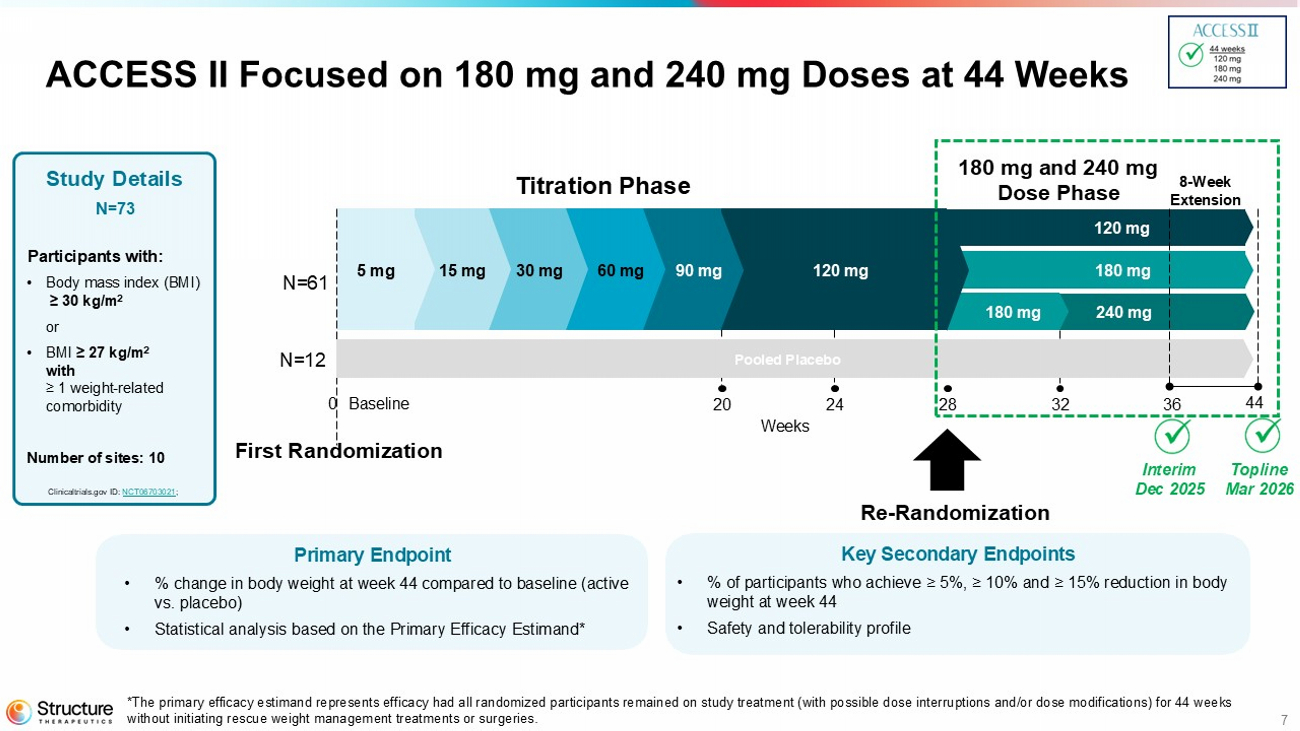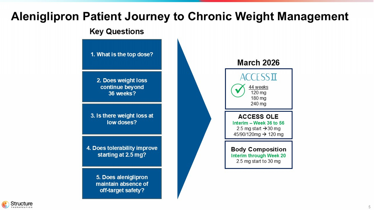Data from ACCESS, ACCESS II, body composition, and the ACCESS OLE studies continue to provide a strong foundation to advance aleniglipron into Phase 3 clinical development. The Company has a Type B End-of-Phase 2 meeting with the United States Food and Drug Administration (FDA) scheduled in the second quarter of 2026 to finalize the Phase 3 design, which is currently designed with a starting titration dose of 2.5 mg with the intent to evaluate multiple doses up to 240 mg. Structure Therapeutics anticipates initiating the Phase 3 program in the second half of 2026.