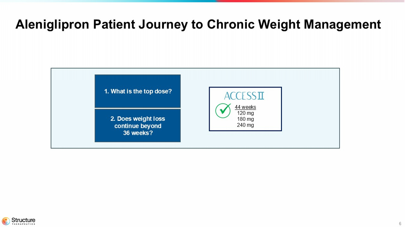 5 Aleniglipron Patient Journey to Chronic Weight Management Key Questions 44 weeks 120 mg 180 mg 240 mg ACCESS OLE Interim – Week 36 to 56 2.5 mg start 3 0 mg 45/90/120mg 120 mg Body Composition Interim through Week 20 2.5 mg start to 30 mg March 2026 1. What is the top dose? 2. Does weight loss continue beyond 36 weeks? 3 . Is there weight loss at low doses? 5. Does aleniglipron maintain absence of off - target safety? 4 . Does tolerability improve starting at 2.5 mg?