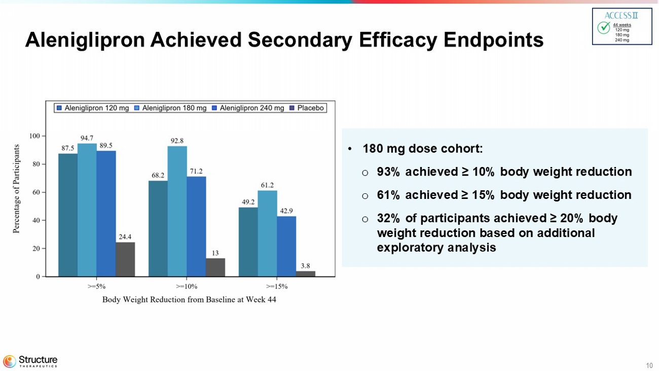 9 Aleniglipron Achieved Greater Weight Loss at 44 weeks Least - Squares Mean (LSM) Change (%) Body Weight *LS Mean Difference based on Primary Efficacy Estimand and MMRM model 37 lbs 39 lbs 33 lbs - 14.7% ( - 20.3 to - 9.1) P<0.0001 - 16.3% ( - 21.7 to - 10.9) P<0.0001 - 16.0% ( - 21.5 to - 10.6) P<0.0001 LSM (95% CI) 120 mg 180 mg 240 mg Placebo Placebo - adjusted Mean Body Weight Loss (%) • No evidence of weight loss plateau across all dose ranges • 16.3%* placebo - adjusted mean weight loss with 180 mg at 44 weeks 0.4 lbs Interim Dec 2025 Topline Mar 2026