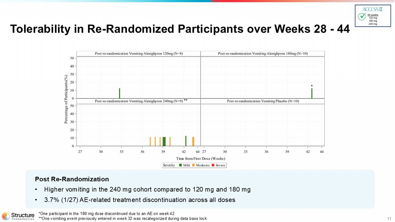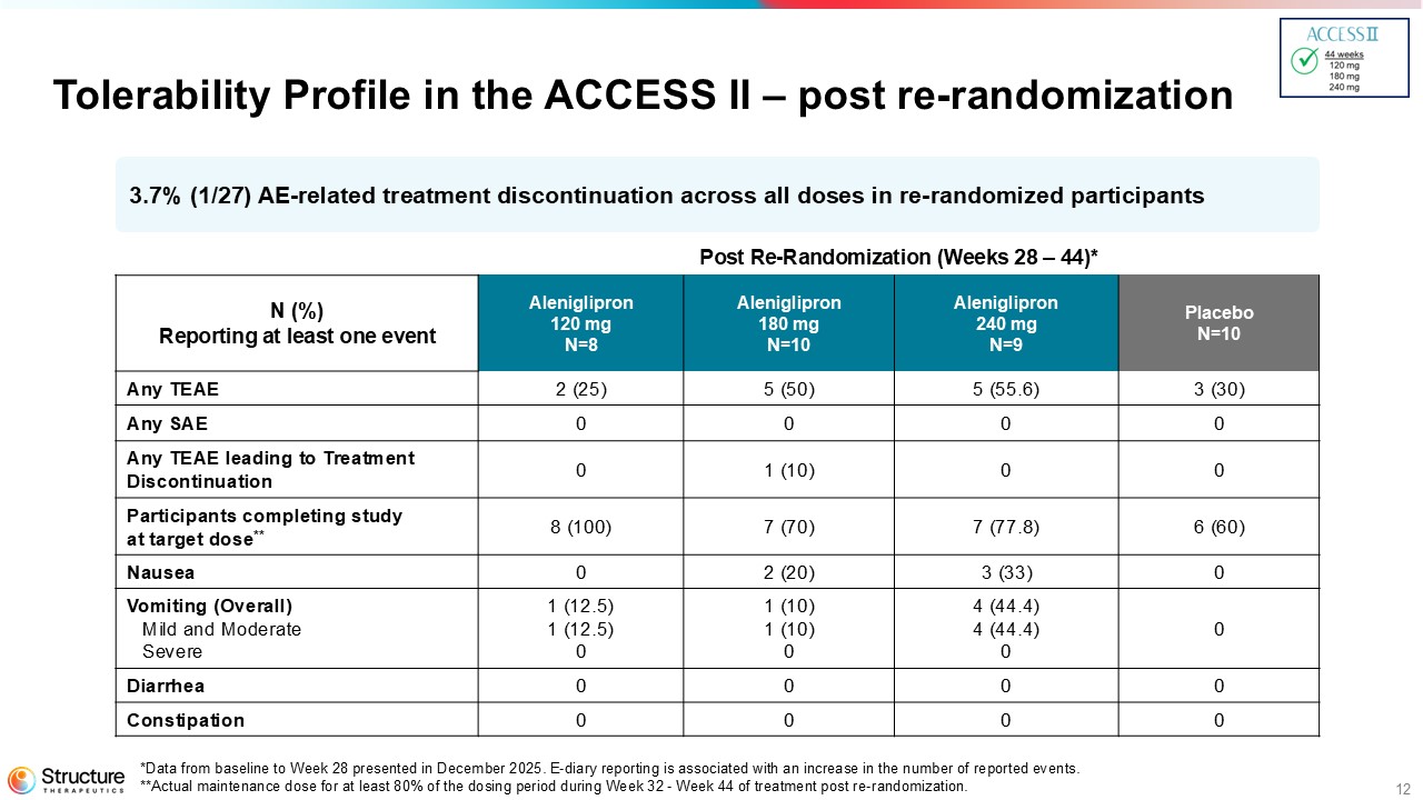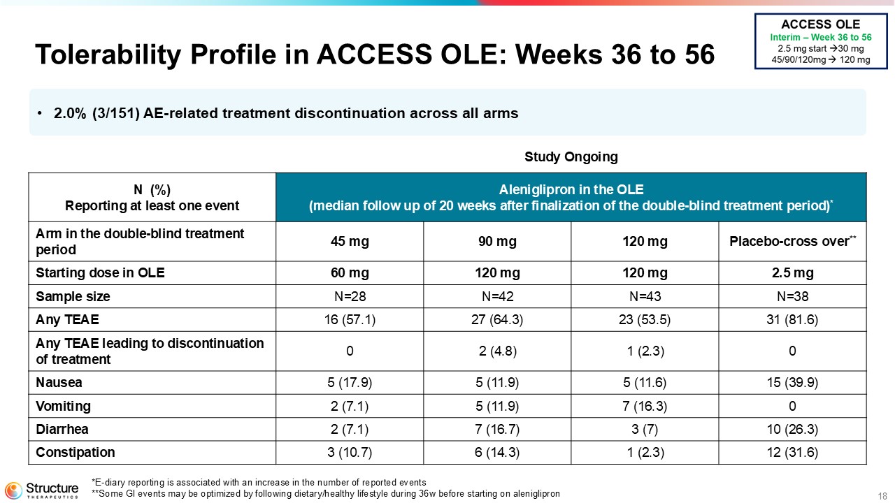 Aleniglipron continues to demonstrate a tolerability profile that is consistent with the GLP-1 receptor agonist class and a compelling safety profile with no off-target events. In ACCESS II, across all active arms in participants who reached doses 120 mg or higher from 28 to 44 weeks, there was only one (3.7%) adverse event (AE)-related treatment discontinuation.