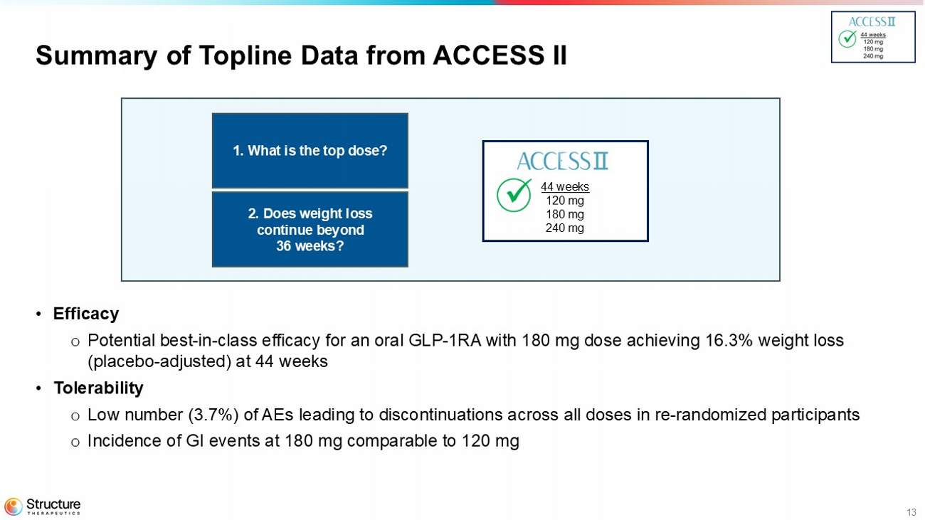 12 Tolerability Profile in the ACCESS II – post re - randomization Post Re - Randomization (Weeks 28 – 44)* Placebo N=10 Aleniglipron 240 mg N=9 Aleniglipron 180 mg N=10 Aleniglipron 120 mg N=8 N (%) Reporting at least one event 3 (30) 5 (55.6) 5 (50) 2 (25) Any TEAE 0 0 0 0 Any SAE 0 0 1 (10) 0 Any TEAE leading to Treatment Discontinuation 6 (60) 7 (77.8) 7 (70) 8 (100) Participants completing study at target dose ** 0 3 (33) 2 (20) 0 Nausea 0 4 (44.4) 4 (44.4) 0 1 (10) 1 (10) 0 1 (12.5) 1 (12.5) 0 Vomiting (Overall) Mild and Moderate Severe 0 0 0 0 Diarrhea 0 0 0 0 Constipation 3.7% (1/27) AE - related treatment discontinuation across all doses in re - randomized participants *Data from baseline to Week 28 presented in December 2025. E-diary reporting is associated with an increase in the number of reported events. **Actual maintenance dose for at least 80% of the dosing period during Week 32 - Week 44 of treatment post re - randomization.