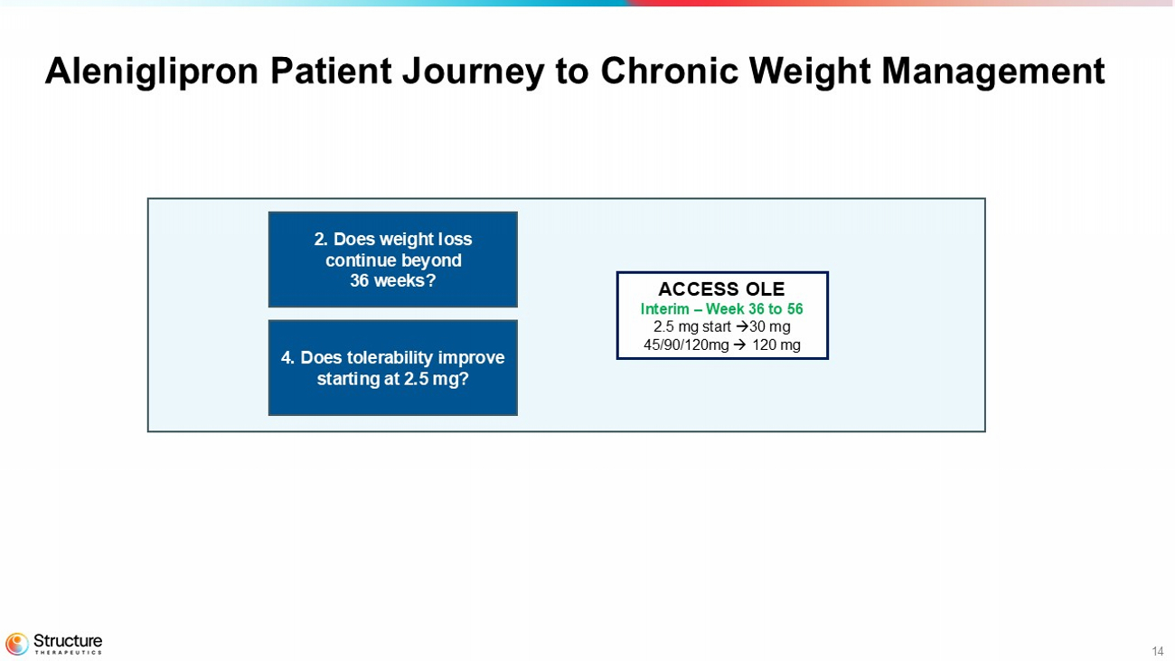 13 Summary of Topline Data from ACCESS II • Efficacy o Potential best - in - class efficacy for an oral GLP - 1RA with 180 mg dose achieving 16.3% weight loss (placebo - adjusted) at 44 weeks • Tolerability o Low number (3.7%) of AEs leading to discontinuations across all doses in re - randomized participants o Incidence of GI events at 180 mg comparable to 120 mg 44 weeks 120 mg 180 mg 240 mg 1. What is the top dose? 2. Does weight loss continue beyond 36 weeks?