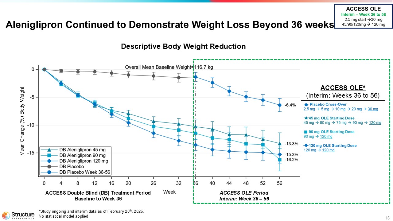 15 120 mg ACCESS OLE Beyond 36 weeks and 2.5 mg Starting Dose Baseline Titration Phase (every 4 weeks) Maintenance Phase (at target dose) ACCESS Primary Endpoint 30 15 5 N=45 N=65 N=64 N=56 *OLE is ongoing up to 72 weeks 45 mg 90 mg 60 30 15 5 120 mg 60 30 15 5 90 Pooled Placebo 75 120 mg 90 60 30 20 10 5 2.5 120 mg 120 mg 60 90 End of OLE Pre - specified interim analysis with a median follow up of ~20 weeks Study Details N=151 Participants who: • Completed the double blind treatment period from ACCESS and • Signed informed consent to continue on the ACCESS OLE Number of sites: 36 ACCESS Open Label Extension Study Objectives • Long - term safety • Durability and maintenance of weight loss from Week 0 to 72 (full study), and Week 36 to 72 (OLE portion) *Study ongoing and interim data from a pre - specified analysis. Interim data as of February 20th, 2026 Double Blind Treatment Period N=28 N=42 N=43 N=38 Weeks 0 20 36 44 56 72 ACCESS OLE* Study Ongoing Reported in Dec 2025