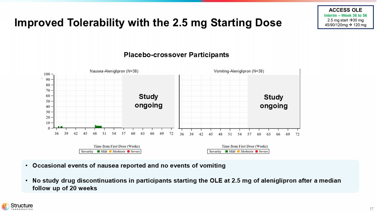 16 Aleniglipron Continued to Demonstrate Weight Loss Beyond 36 weeks *Study ongoing and interim data as of February 20 th , 2026. No statistical model applied Descriptive Body Weight Reduction ACCESS OLE Period Interim: Week 36 – 56 ACCESS Double Blind (DB) Treatment Period Baseline to Week 36 Mean Change (%) Body Weight Placebo Cross - Over 2.5 mg 5 mg 10 mg 20 mg 30 mg ACCESS OLE* (Interim: Weeks 36 to 56) 45 mg OLE Starting Dose 45 mg 75 mg 90 mg 120 mg 90 mg OLE Starting Dose 90 mg 120 mg 120 mg OLE Starting Dose 120 mg 120 mg