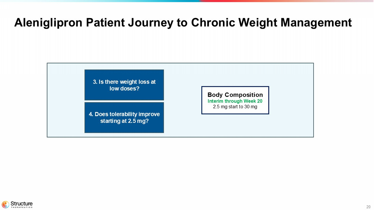 20 Aleniglipron Patient Journey to Chronic Weight Management Body Composition Interim through Week 20 2.5 mg start to 30 mg 3 . Is there weight loss at low doses? 4 . Does tolerability improve starting at 2.5 mg?