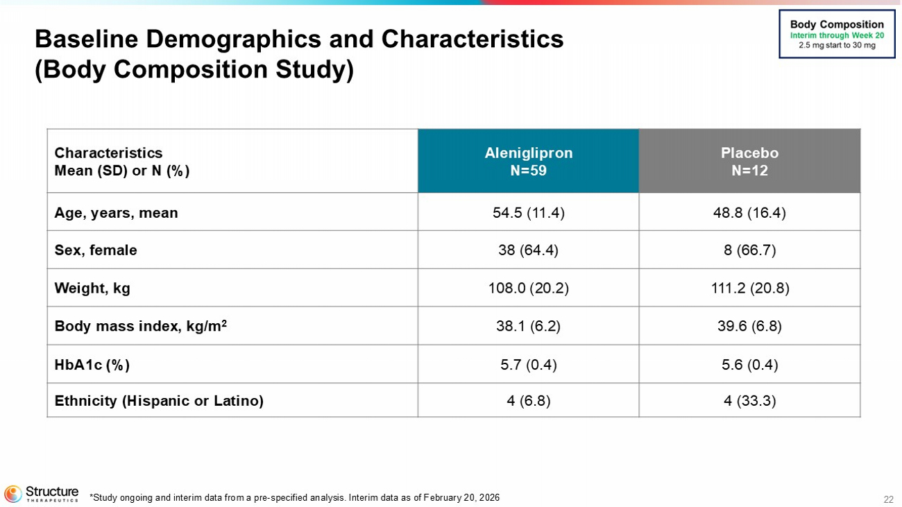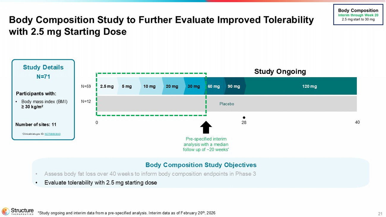 Structure Therapeutics is conducting a randomized, placebo-controlled body composition study that enrolled 71 adult participants to assess the effect of aleniglipron (up to 120 mg) on body fat loss over a 40-week evaluation period. Participants in the aleniglipron treatment arm start at a 2.5 mg dose, and titrate up monthly to a target dose of 120 mg.