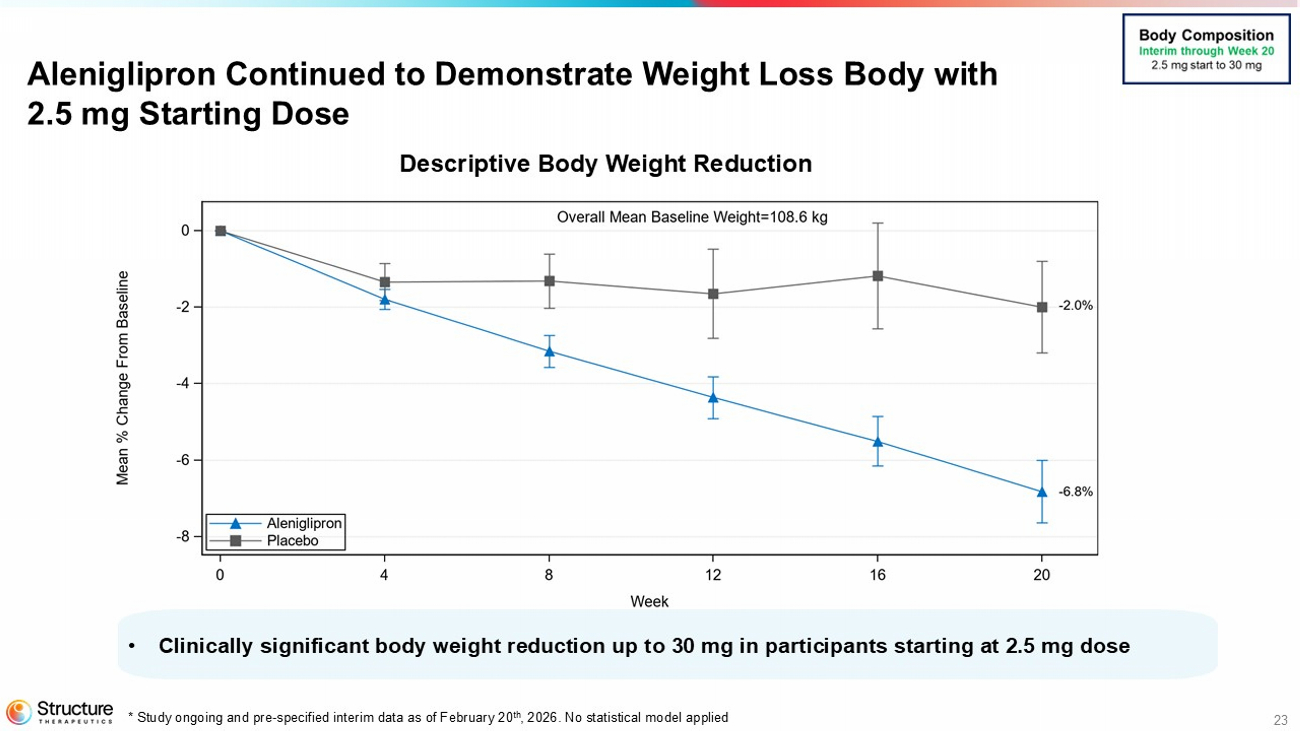 22 Baseline Demographics and Characteristics (Body Composition Study) Placebo N=12 Aleniglipron N=59 Characteristics Mean (SD) or N (%) 48.8 (16.4) 54.5 (11.4) Age, years, mean 8 (66.7) 38 (64.4) Sex, female 111.2 (20.8) 108.0 (20.2) Weight, kg 39.6 (6.8) 38.1 (6.2) Body mass index, kg/m 2 5.6 (0.4) 5.7 (0.4) HbA1c (%) 4 (33.3) 4 (6.8) Ethnicity (Hispanic or Latino) *Study ongoing and interim data from a pre - specified analysis. Interim data as of February 20, 2026
