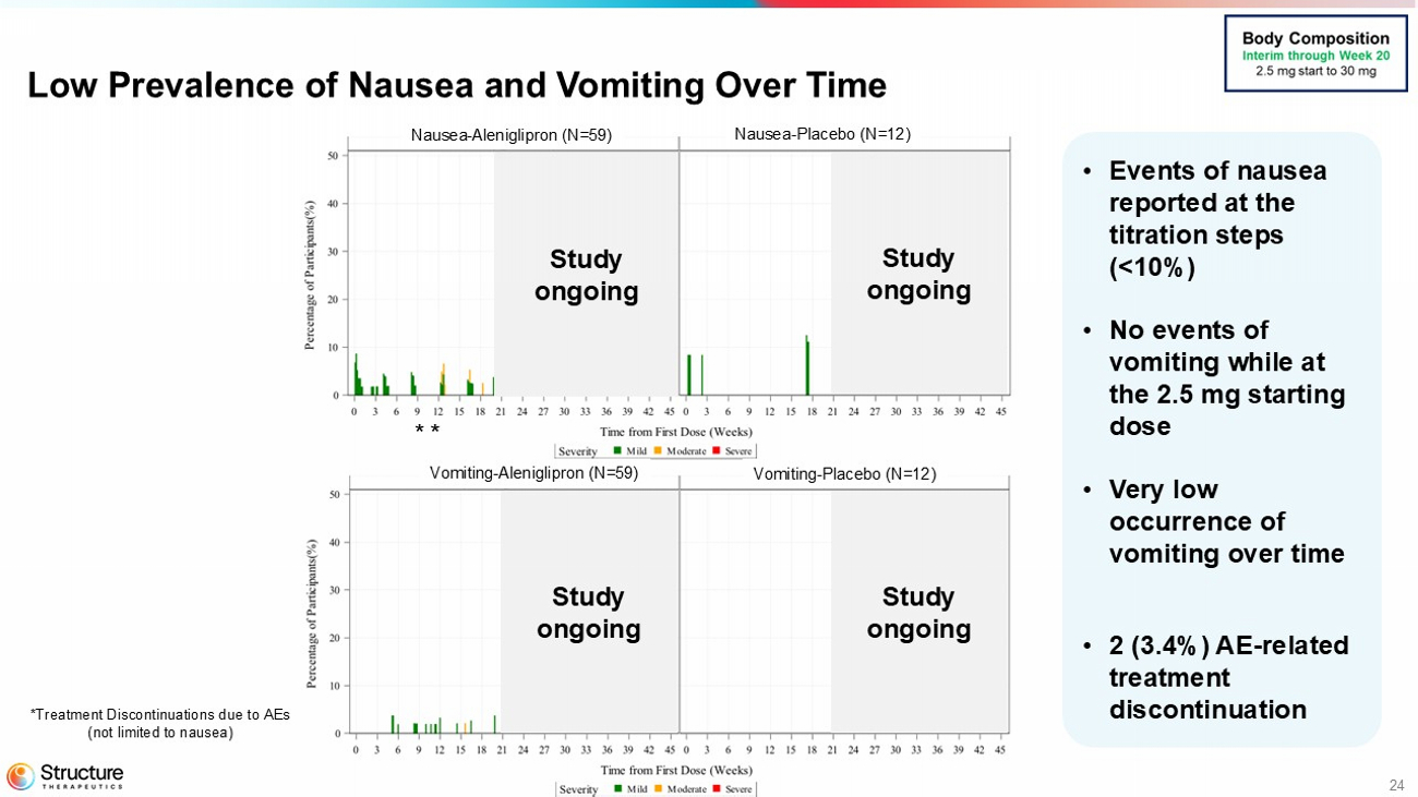 23 Aleniglipron Continued to Demonstrate Weight Loss Body with 2.5 mg Starting Dose Percent Change in Body Weight, % * Study ongoing and pre - specified interim data as of February 20 th , 2026. No statistical model applied • Clinically significant body weight reduction up to 30 mg in participants starting at 2.5 mg dose Descriptive Body Weight Reduction
