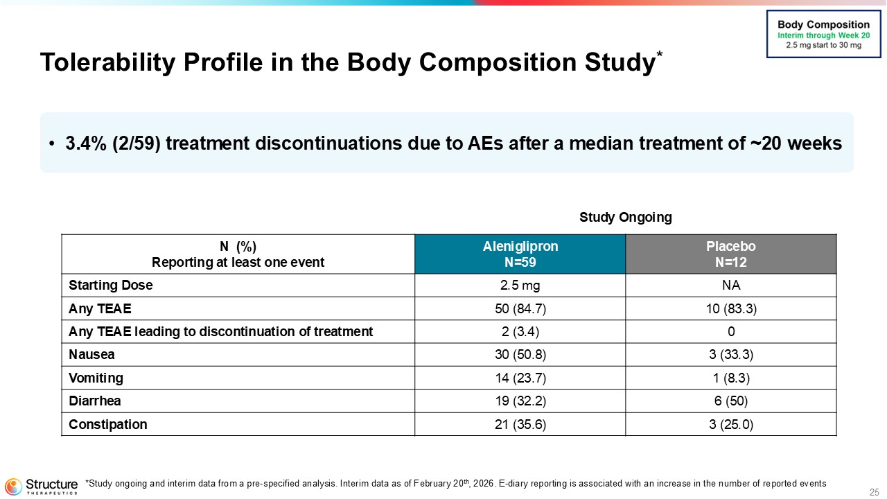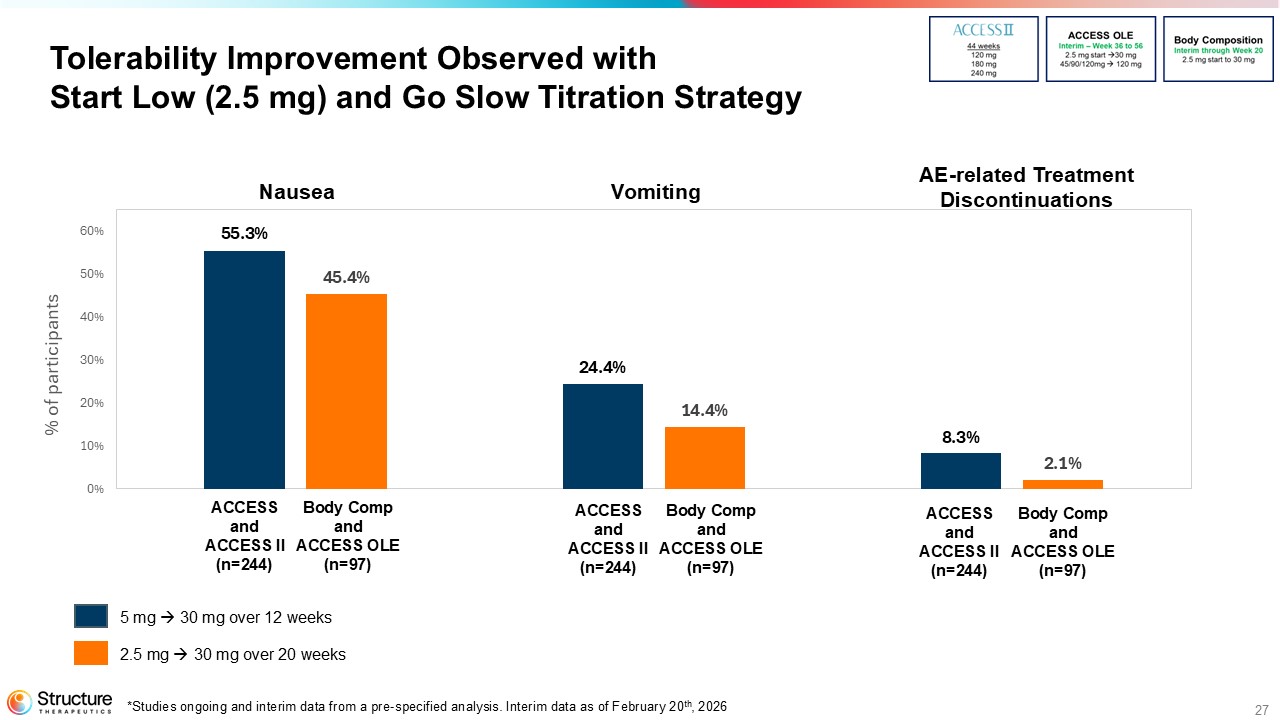 With a median follow-up of 20 weeks, the tolerability data as of the February 20, 2026 cutoff date from the interim analyses of the OLE and the body composition studies provide further support that the use of 2.5 mg as a lower starting dose very meaningfully reduces the rate of AE-related discontinuations during the titration phase. In the OLE, with a median follow-up of 20 weeks, there was an overall AE-related discontinuation rate of 2%. In the body composition study, with a median follow-up of 20 weeks, there was an overall AE-related discontinuation rate of 3.4% in the aleniglipron arm.