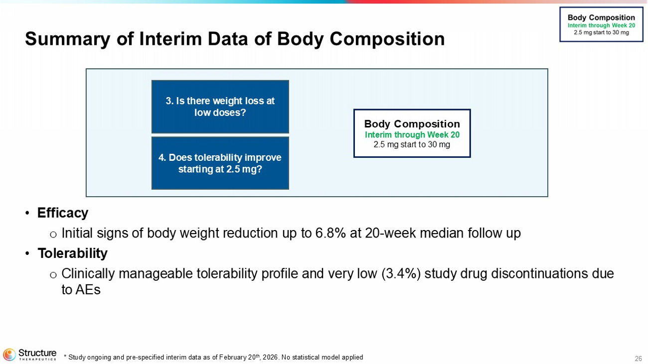 25 Tolerability Profile in the Body Composition Study * Study Ongoing Placebo N=12 Aleniglipron N=59 N (%) Reporting at least one event NA 2.5 mg Starting Dose 10 (83.3) 50 (84.7) Any TEAE 0 2 (3.4) Any TEAE leading to discontinuation of treatment 3 (33.3) 30 (50.8) Nausea 1 (8.3) 14 (23.7) Vomiting 6 (50) 19 (32.2) Diarrhea 3 (25.0) 21 (35.6) Constipation • 3.4% (2/59) treatment discontinuations due to AEs after a median treatment of ~20 weeks *Study ongoing and interim data from a pre - specified analysis. Interim data as of February 20 th , 2026. E-diary reporting is associated with an increase in the number of reported events.