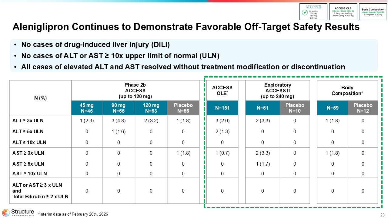 29 Aleniglipron Continues to Demonstrate Favorable Off - Target Safety Results • No cases of drug - induced liver injury (DILI) • No cases of ALT or AST ≥ 10x upper limit of normal (ULN) • All cases of elevated ALT and AST resolved without treatment modification or discontinuation * Interim data as of February 20th, 2026 Body Composition* Exploratory ACCESS II (up to 240 mg) ACCESS OLE * Phase 2b ACCESS (up to 120 mg) N (%) Placebo N=12 N=59 Placebo N=10 N=61 N=151 Placebo N=56 120 mg N=63 90 mg N=65 45 mg N=45 0 1 (1.8) 0 2 (3.3) 3 (2.0) 1 (1.8) 2 (3.2) 3 (4.8) 1 (2.3) ALT ≥ 3x ULN 0 0 0 0 2 (1.3) 0 0 1 (1.6) 0 ALT ≥ 5x ULN 0 0 0 0 0 0 0 0 0 ALT ≥ 10x ULN 0 1 (1.8) 0 2 (3.3) 1 (0.7) 1 (1.8) 0 0 0 AST ≥ 3x ULN 0 0 0 1 (1.7) 0 0 0 0 0 AST ≥ 5x ULN 0 0 0 0 0 0 0 0 0 AST ≥ 10x ULN 0 0 0 0 0 0 0 0 0 ALT or AST ≥ 3 x ULN and Total Bilirubin ≥ 2 x ULN
