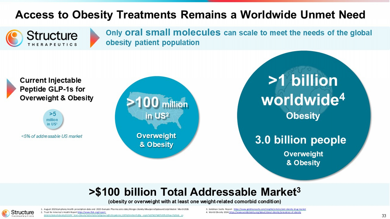 33 1. August 2025 Symphony Health prescriptio n data and 2025 Evaluate Pharma sales data ; Morgan Stanley Mounjaro+Zepbound Script tracker . March 2026 2. Trust for America’s Health Rep ort https://www.tfah .org/report - details/stateofobesity2019/#:~:text=Obesity%20is%20a%20growing%20epidemic,100%20million%20p eople%20%E2%80%93%20have%20ob es 3. Goldman Sachs Report https://www.goldmansachs.com/insights/articles/anti - obesity - drug - market 4. World Obesity 2024 https:// www.worldobesity.org/about/about - obesity/prevalence - of - obesity >5 million in US 1 >$100 billion Total Addressable Marke t 3 (obesity or overweight with at least one weight - related comorbid condition) >100 million in US 2 Overweight & Obesity Current Injectable Peptide GLP - 1s for O verweight & Obesity <5% of addressable US market Access to Obesity Treatments Remains a Worldwide Unmet Need Only oral small molecules can scale to meet the needs of the global obesity patient population >1 billion worldwide 4 Obesity 3.0 billion people Overweight & Obesity